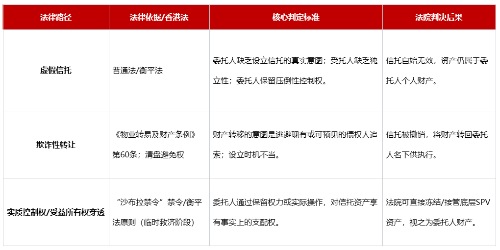 实质控制权优先于法律文件:传统的“虚假信托”诉讼耗时且举证困难。现代司法趋势倾向于采用更务实的手段。正如许家印案件中引用的判例所示,法官可以直接认定:如果委托人通过保留权力或实际操作,对信托资产或底层SPV享有事实上的支配权,法院就可以在临时救济阶段(如资产冻结)直接将这些资产视为委托人的财产。这种做法跳过了冗长的“信托无效”证明,直接实现了资产的冻结和接管。