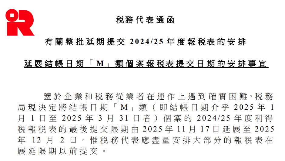 随着2025年接近尾声,2024/25年度的香港利得税申报工作也进入了最后的冲刺阶段。根据香港税务局于2025年10月2日发出的通告,对于结账日期「M」类(即公司财政年度结账日期在2025年1月1日至3月31日之间)的企业,提交2024/25年度香港利得税报税表的最后期限由2025年11月17日延至2025年12月2日。