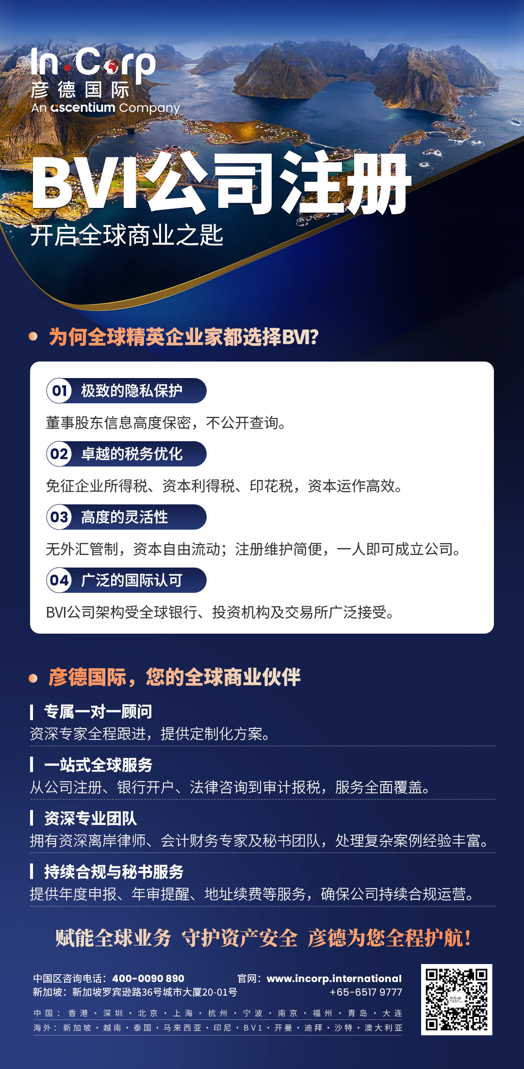 英属维尔京群岛(BVI)是全球最受欢迎的离岸公司注册地之一,以其高度保密性、零税制和灵活的法律架构著称,广泛用于国际贸易、投资控股和资产保护。彦德国际作为Ascentium集团旗下子公司,总部设于新加坡,海外公司注册代办机构,2900+专业团队,服务超6万家客户,提供bvi公司注册、bvi公司开户、报税审计、企业年审和跨境合规等一站式服务。