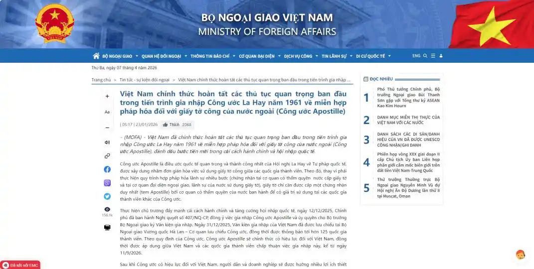 2026年,越南在国际法律整合的道路上迈出了里程碑式的一步:9月11日,越南将正式实施《海牙认证公约》。
